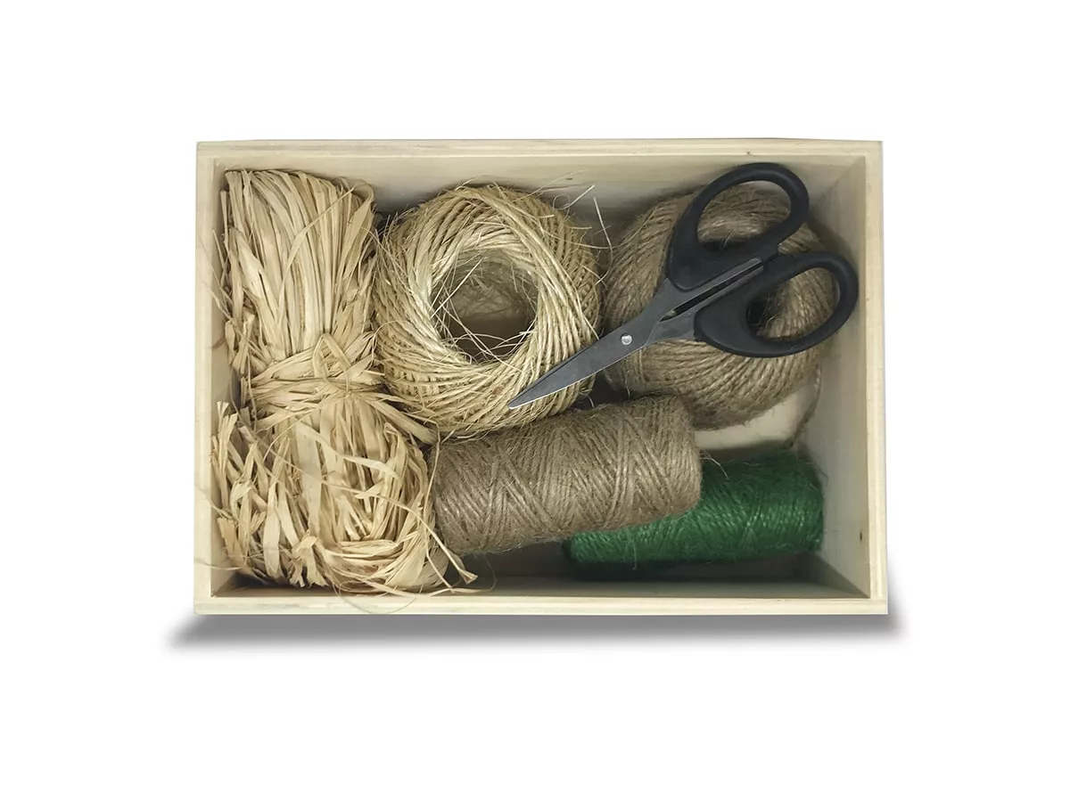 Incluye: 100 metros de yute natural y verde, 60 metros de sisal, 50 gr de rafia y tijeras